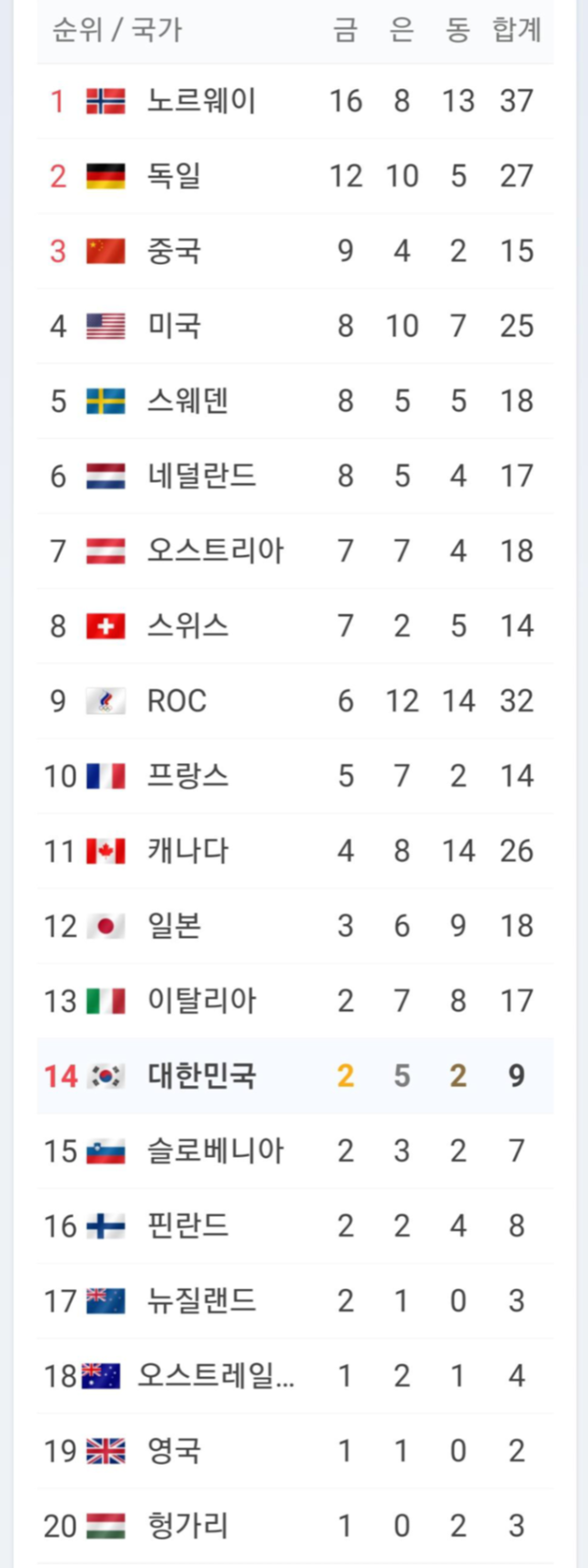 메달 순위는 14위로 1992년 알베르빌 대회 이후 2002년 솔트레이크 대회 14위와 동일하게 30년 만에 역대 최저 타이기록입니다.